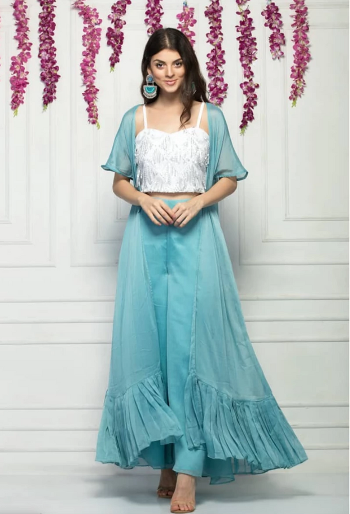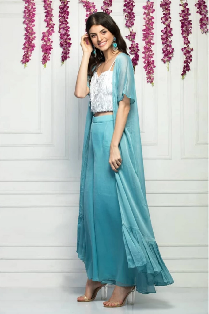 Feel confident and beautiful in this 3-piece beauty! The crop-top, flare pants, and duster jacket make for the perfect outfit! The top features silver sequin embellishments and spaghetti strap sleeves, perfect to move and groove in.